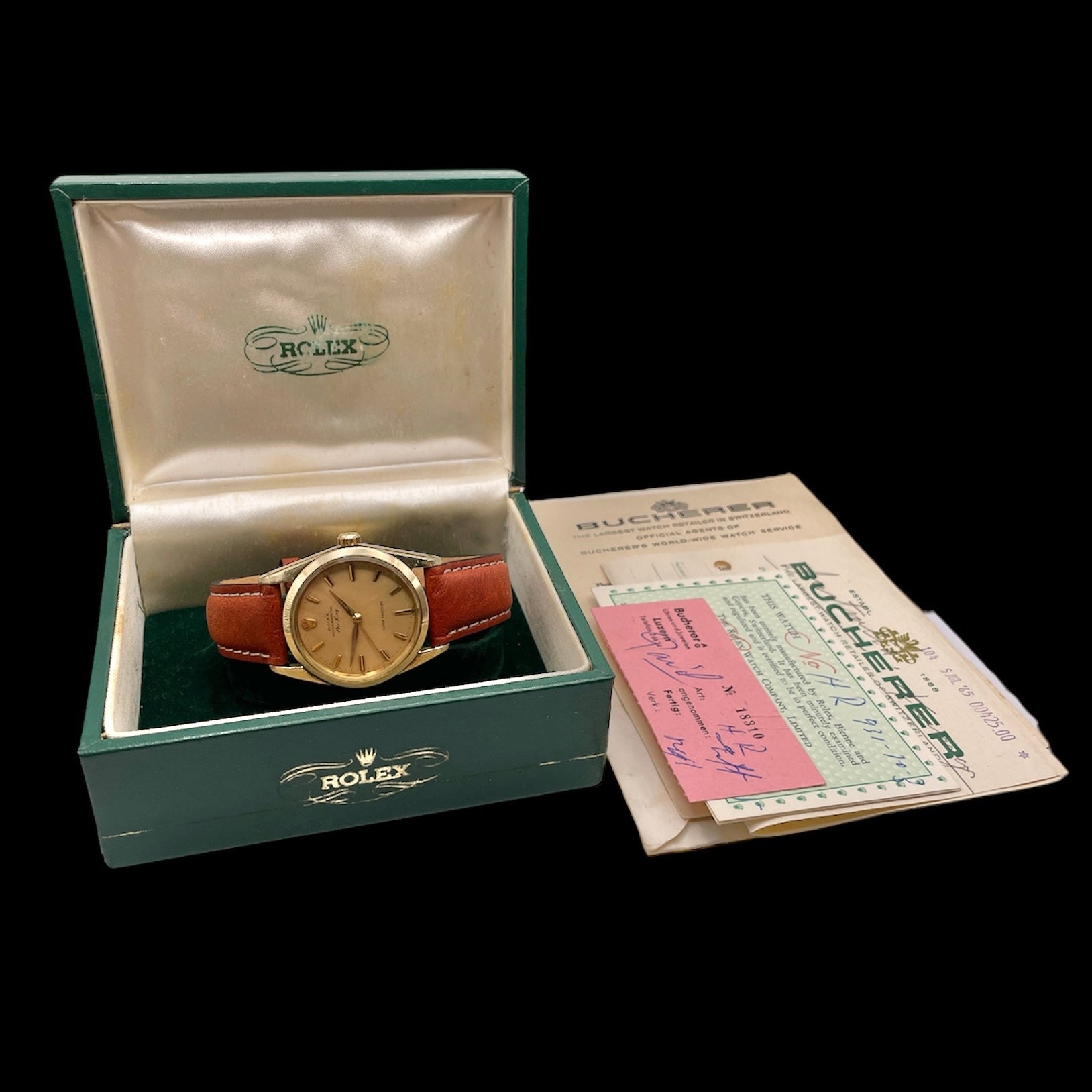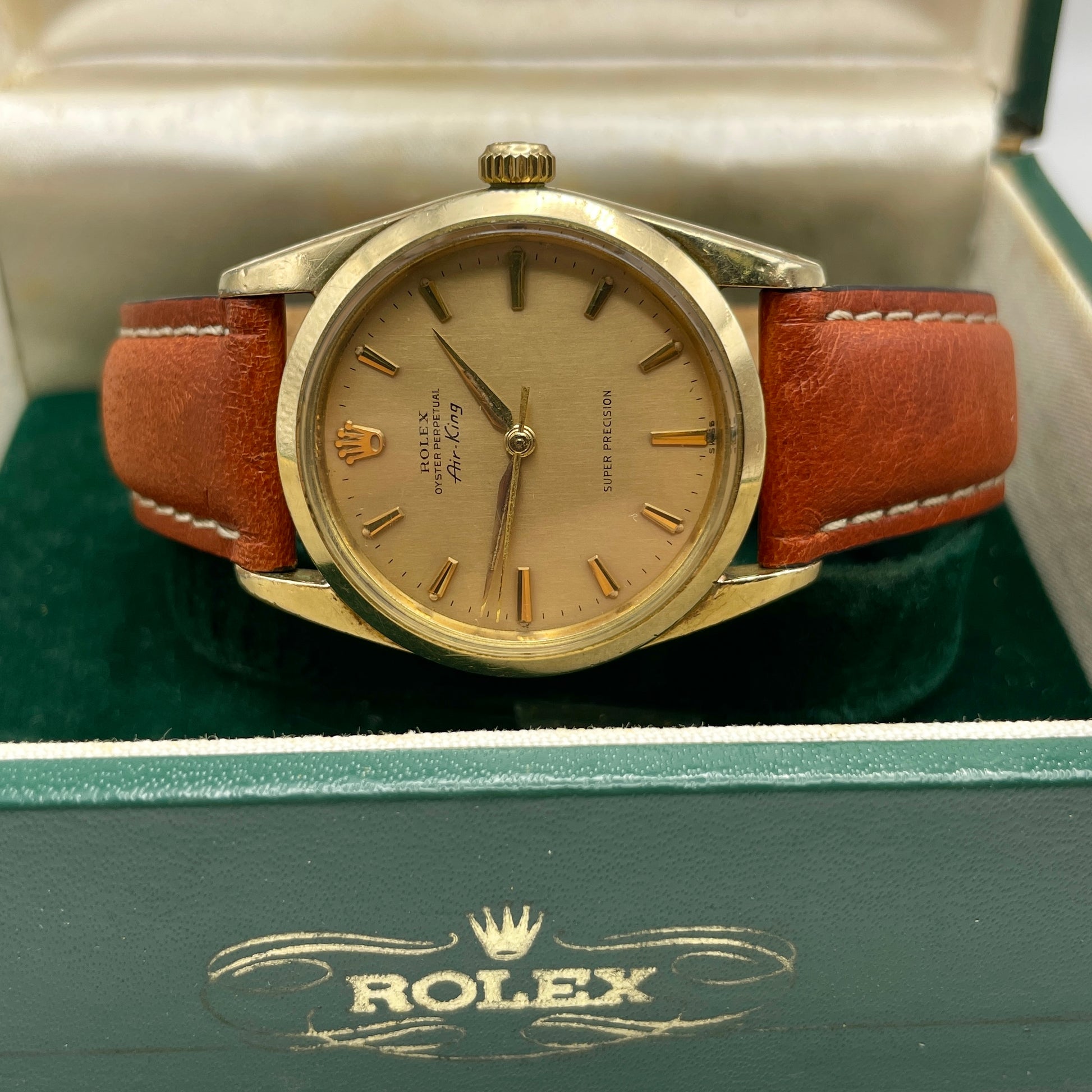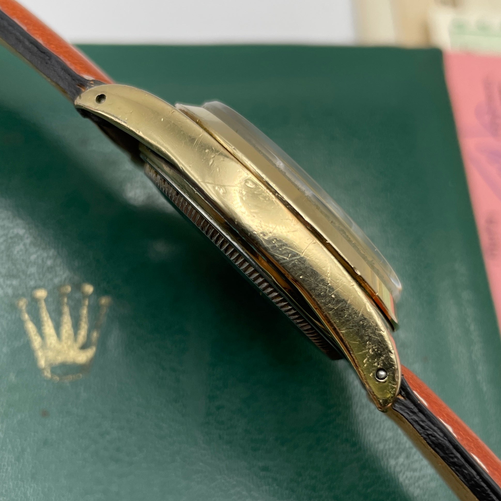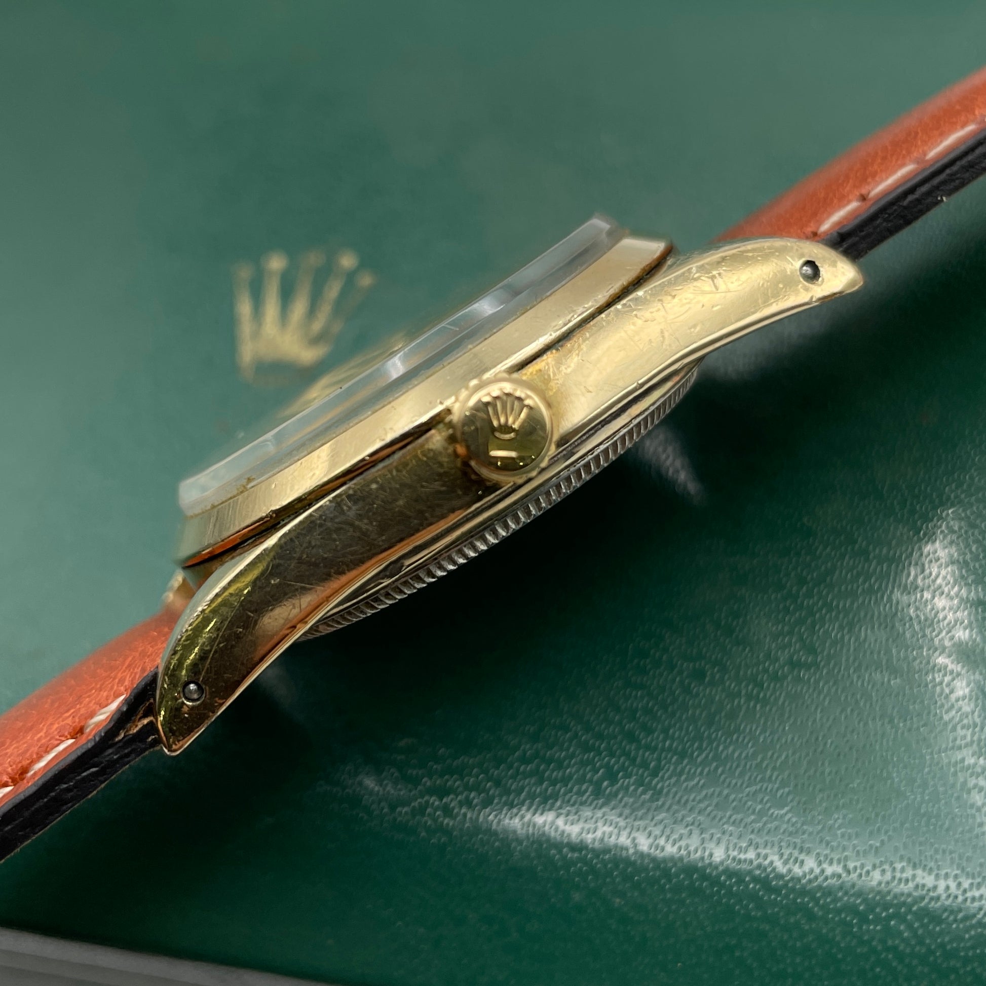 Description: Aftermarket brown leather, smooth bezel and gold dial, automatic mechanism