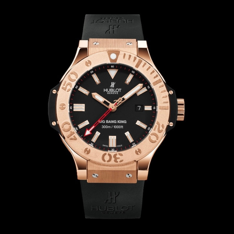 Description: Black rubber strap, rose gold bezel and black dial with luminescent hour markers