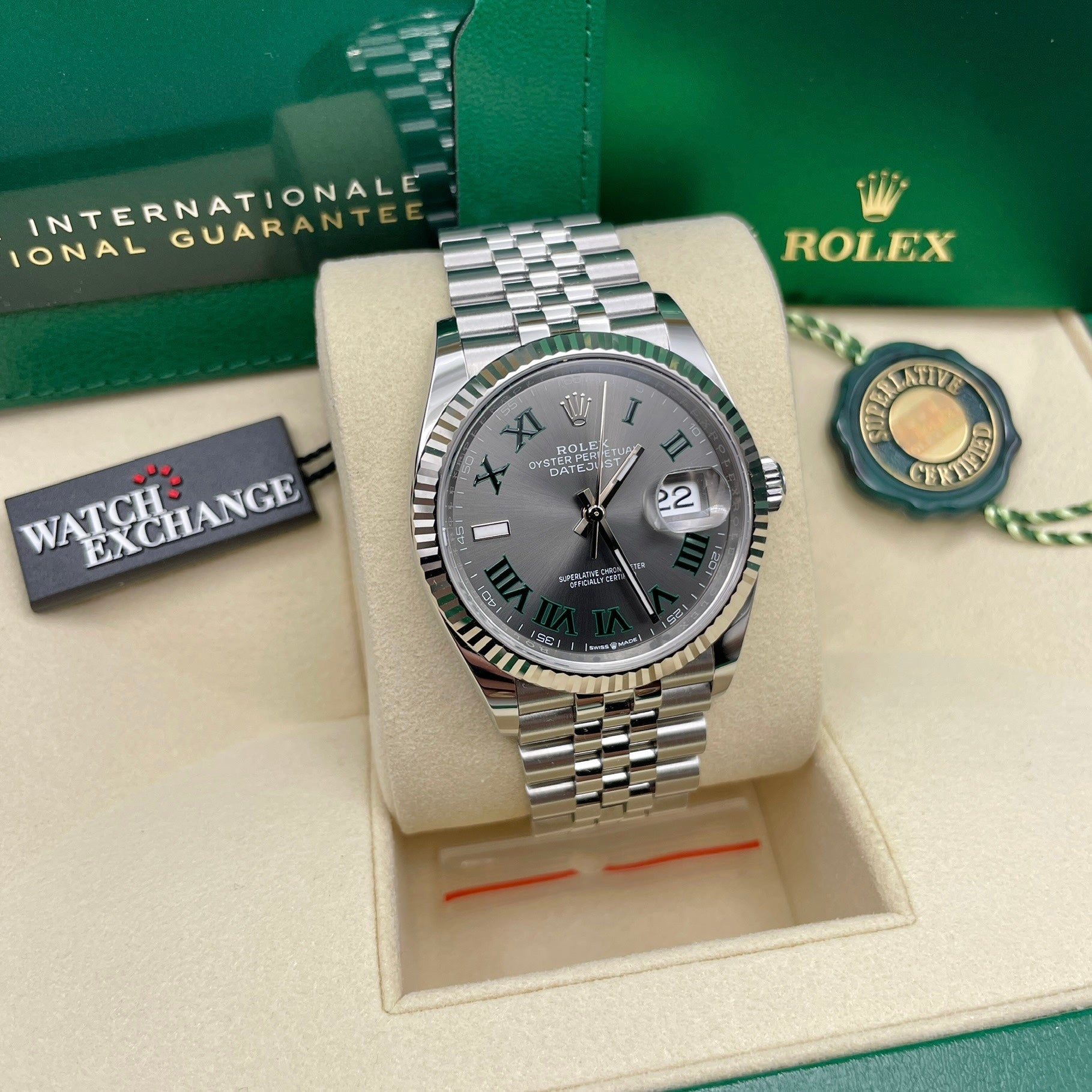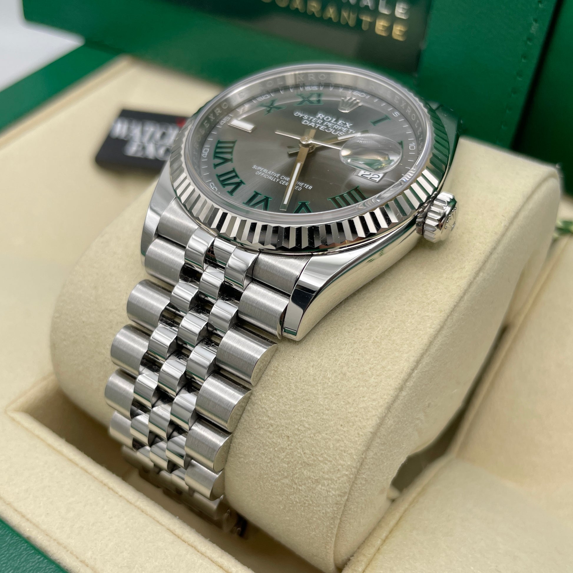 Description: Jubilee bracelet, fluted bezel and slate dial with roman numeral hour markers