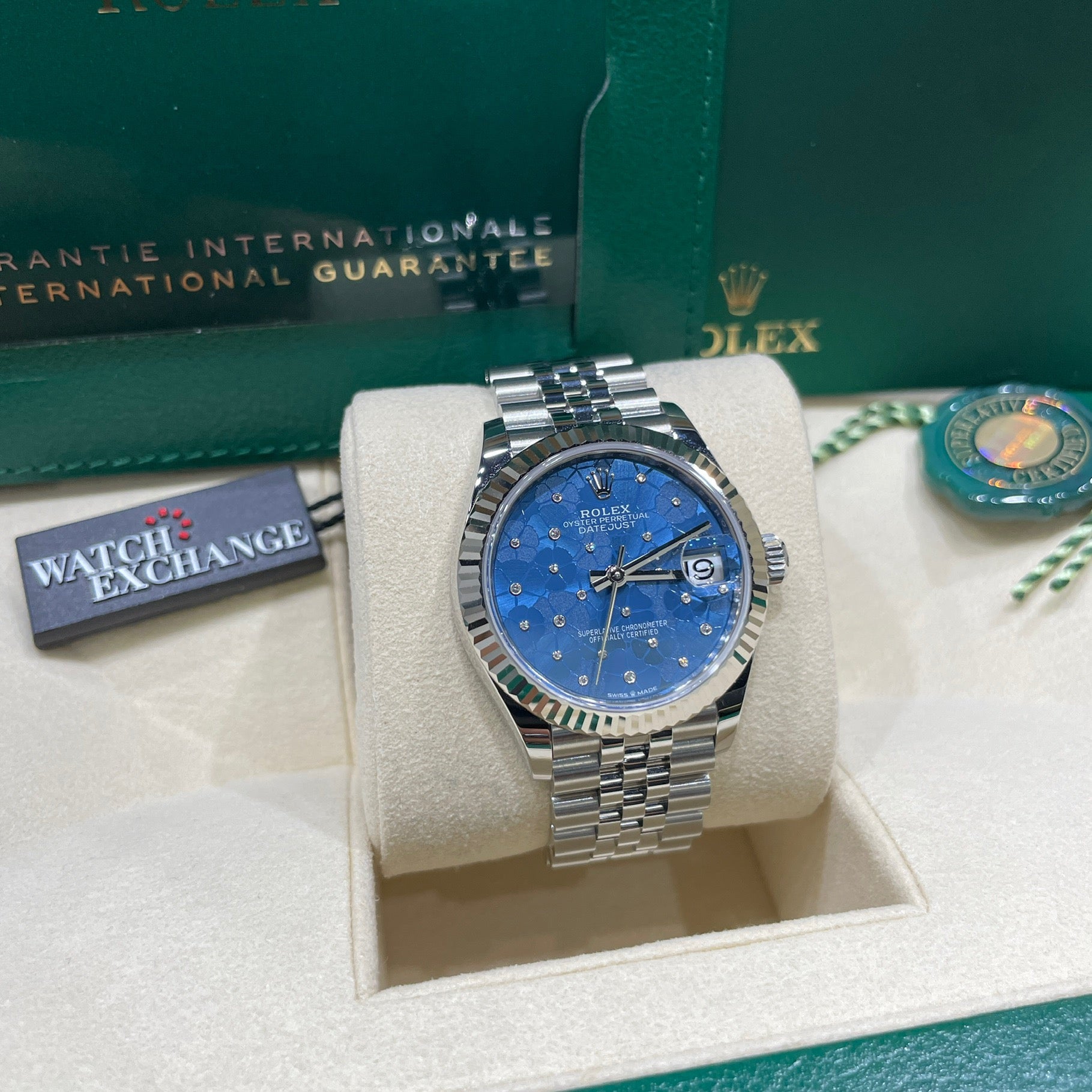 Description: Jubilee bracelet, fluted bezel and diamond set Blue Floral Motif dial. Discontinued model