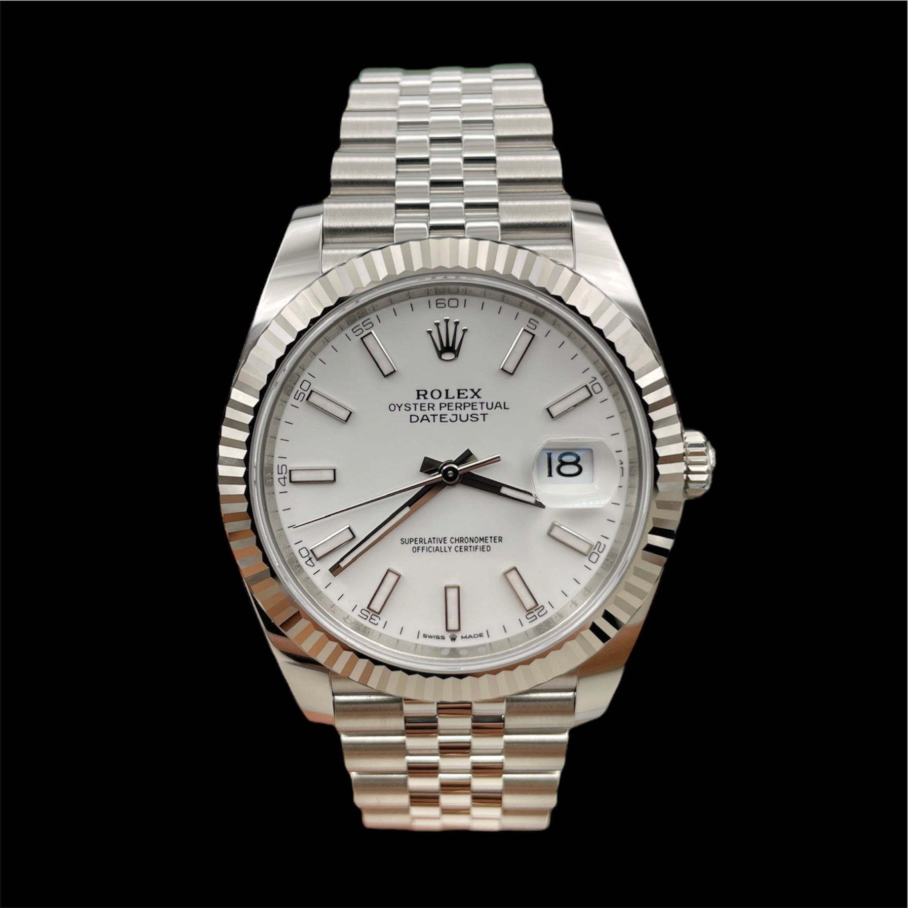 Description: Jubilee bracelet, fluted bezel and white dial with luminescent hour markers
