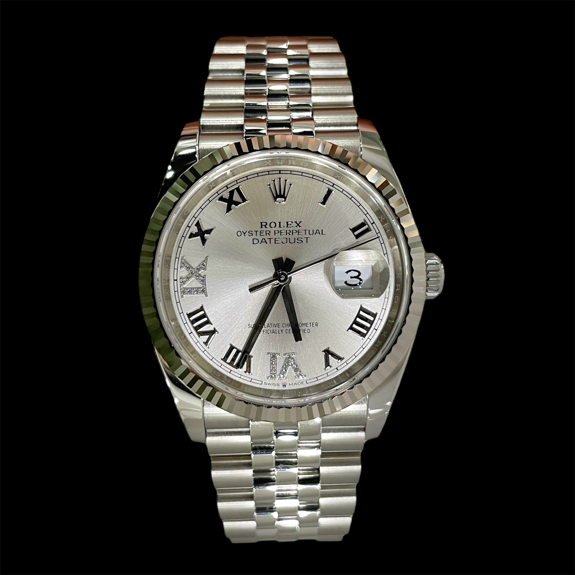 Description: Jubilee bracelet, fluted bezel and silver dial with roman numeral hour markers