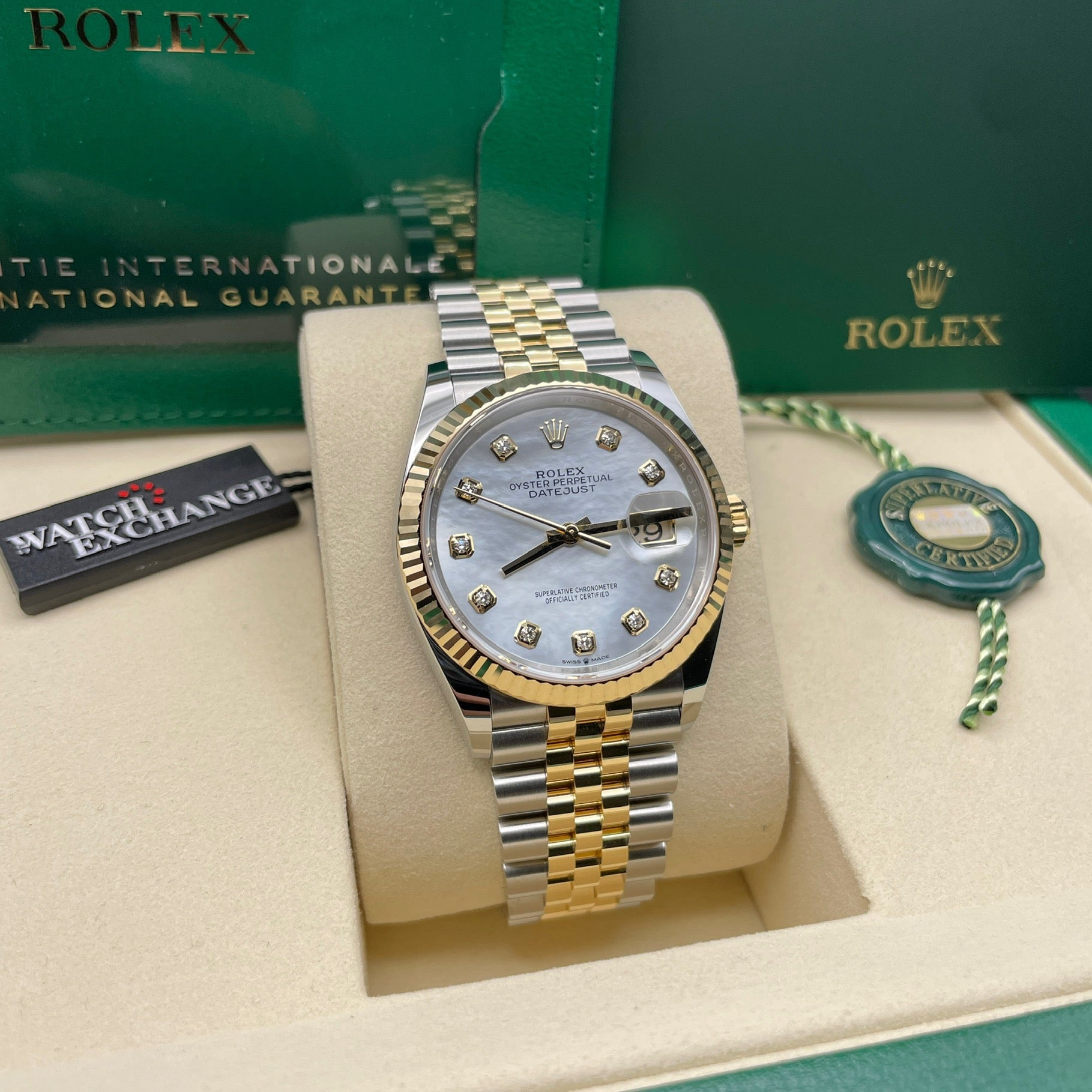 Description: Jubilee bracelet, fluted bezel and mother of pearl diamond set dial