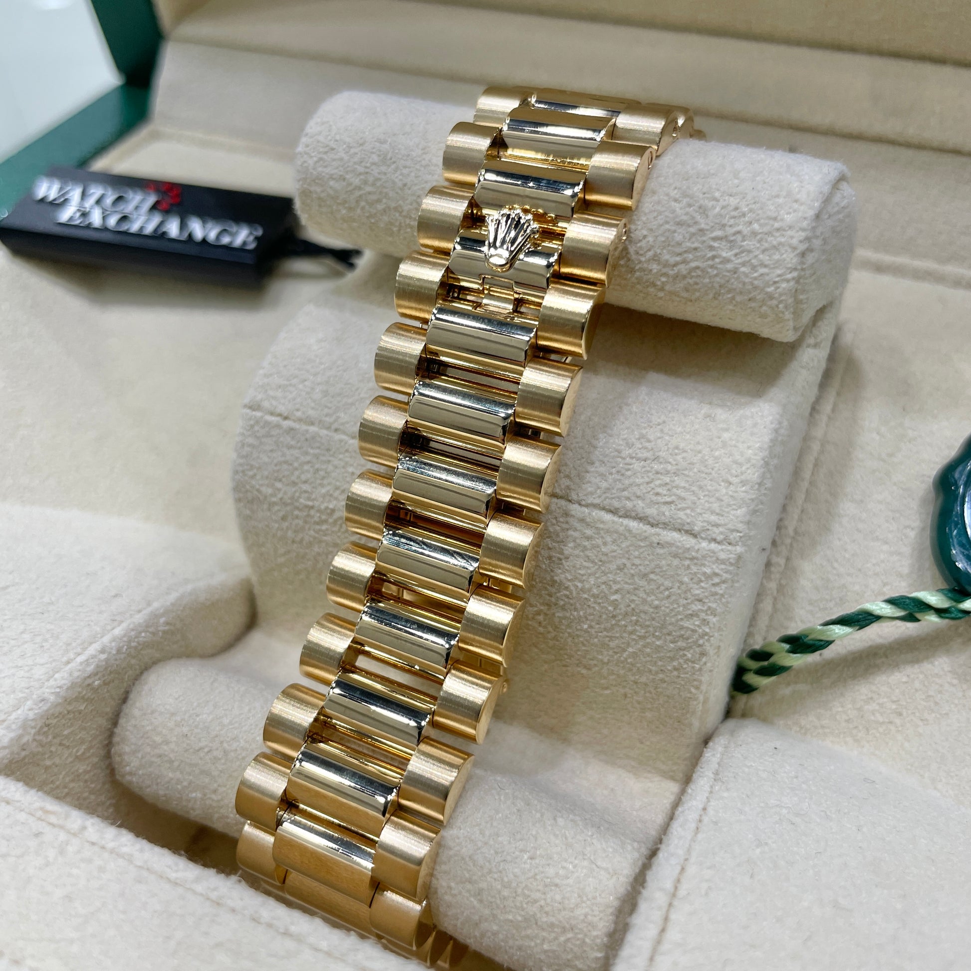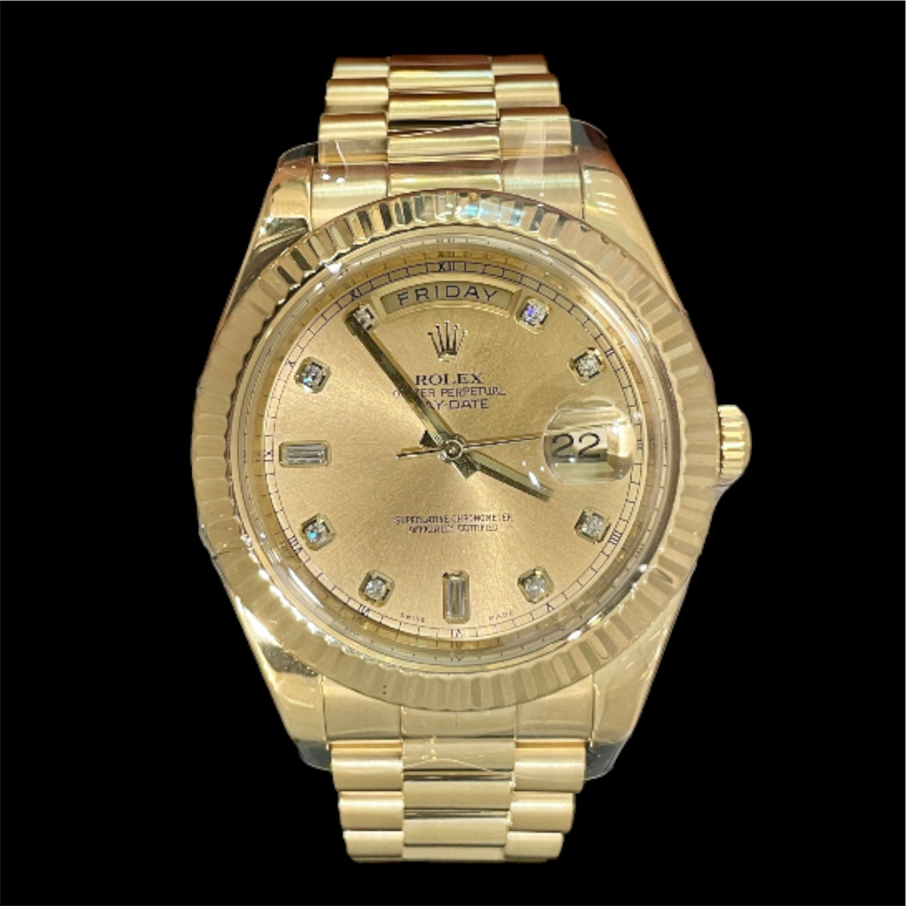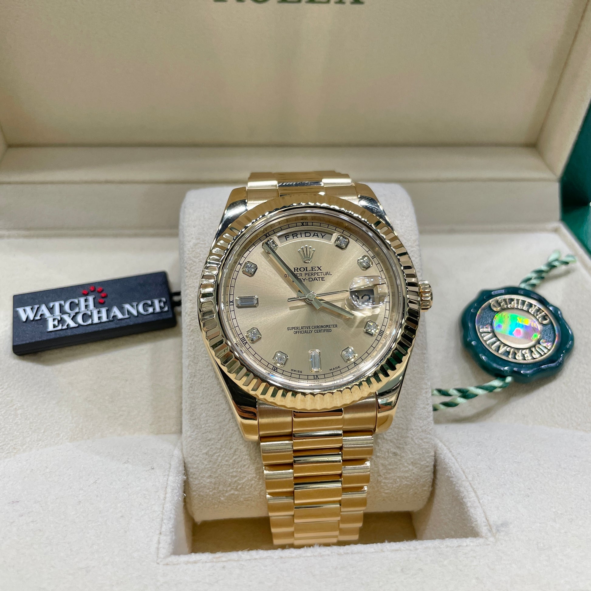 Description: President bracelet, fluted bezel and champagne diamond set dial. Discontinued model