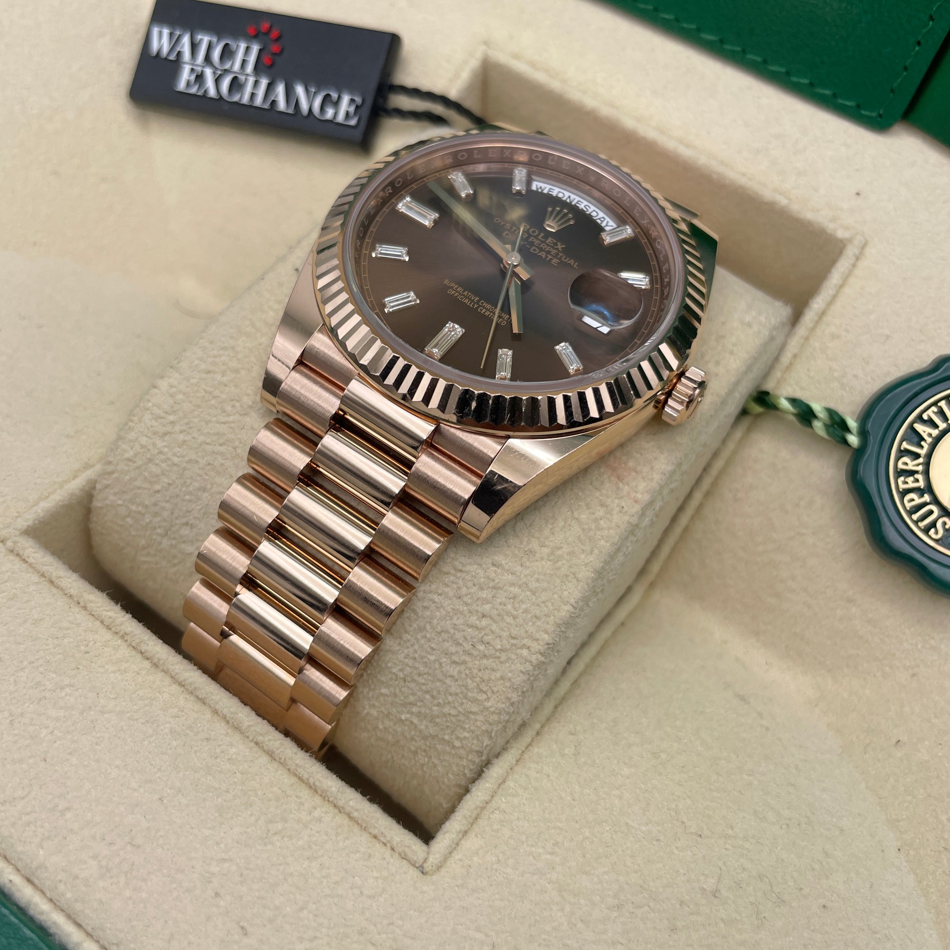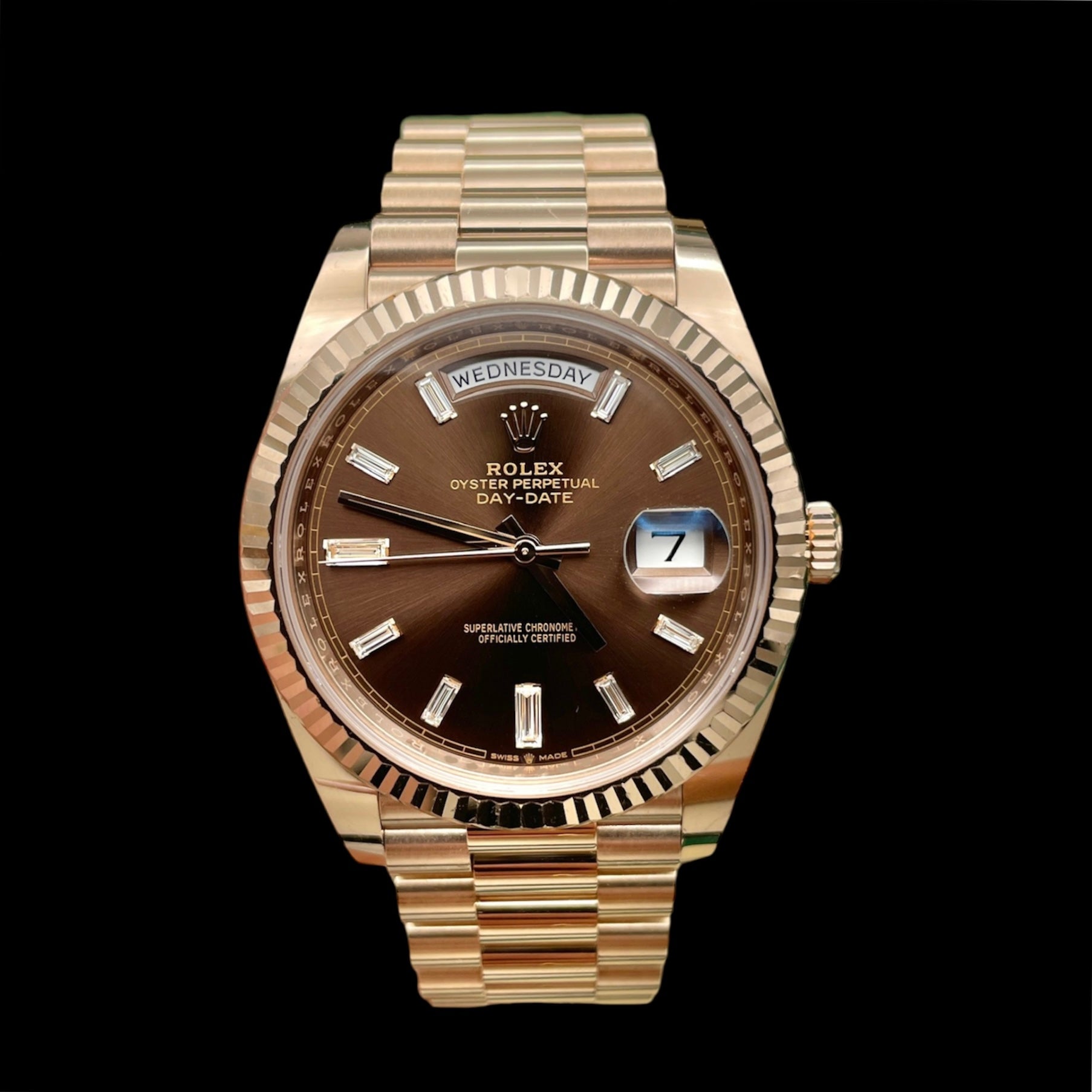 Description: President bracelet, fluted bezel and chocolate diamond set dial