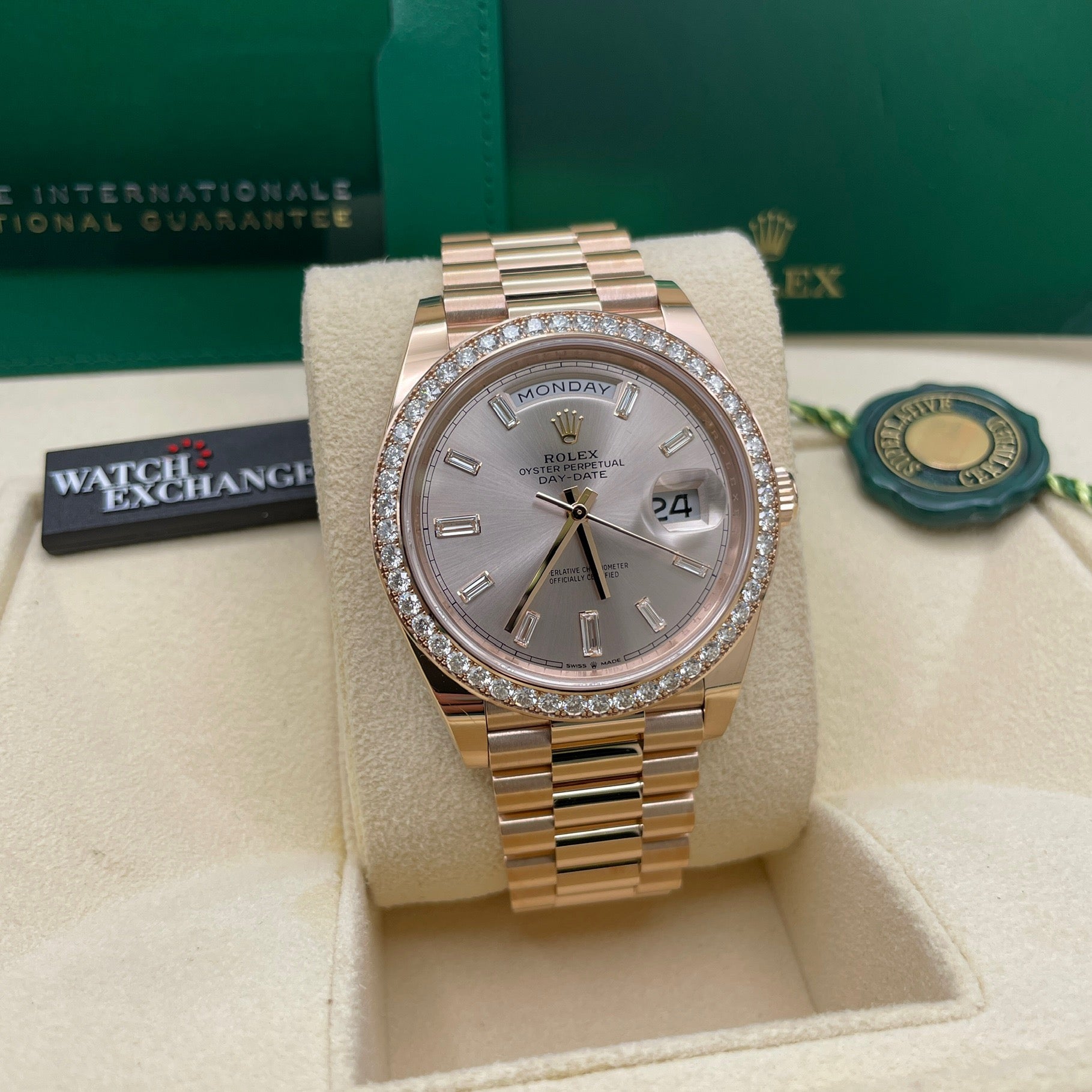 Description: President bracelet, factory diamond set bezel and sundust diamond baguette set dial
