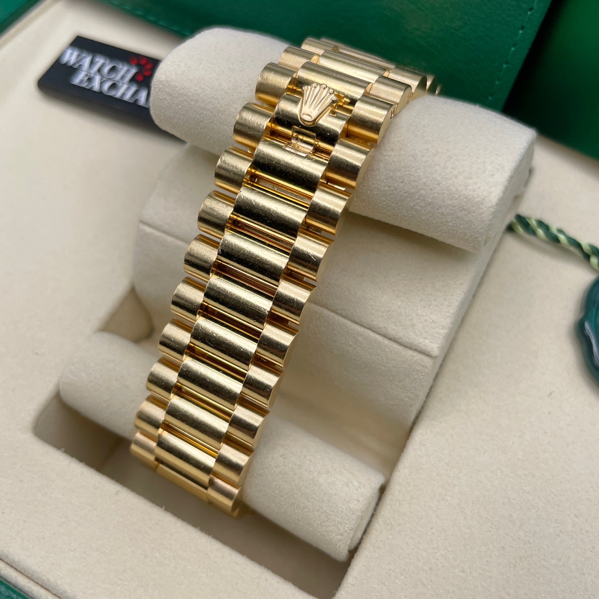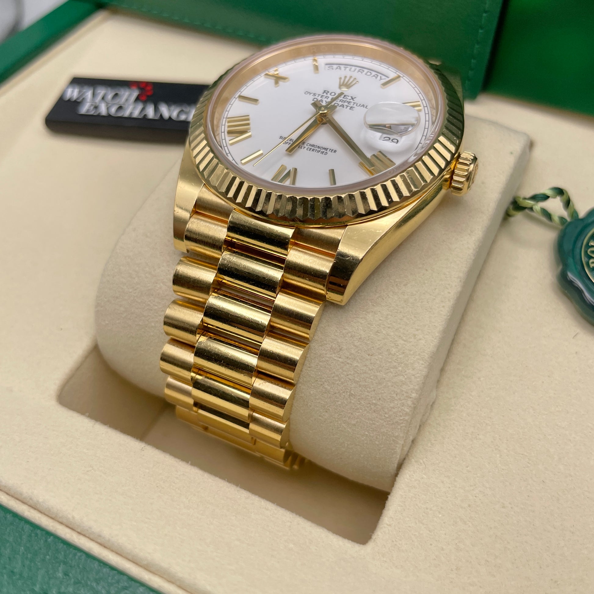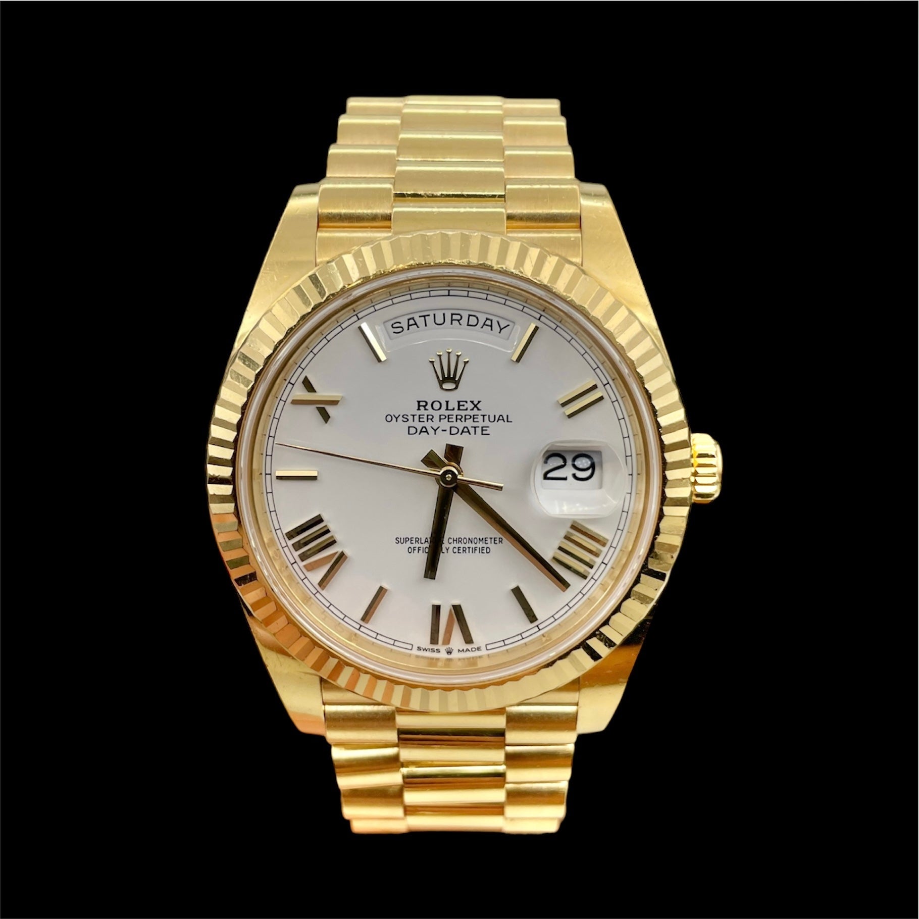 Description: President bracelet, fluted bezel and white dial with roman numeral hour markers