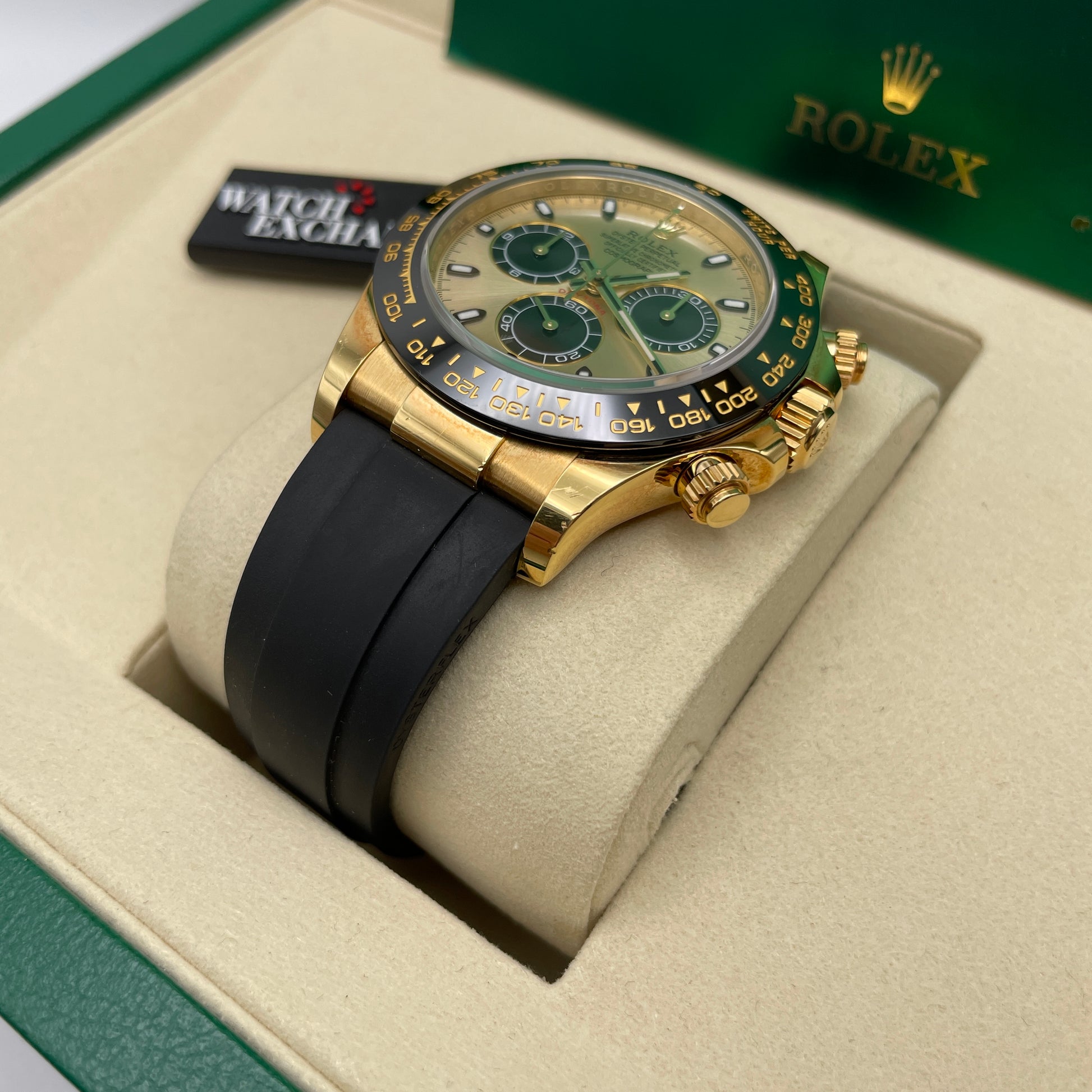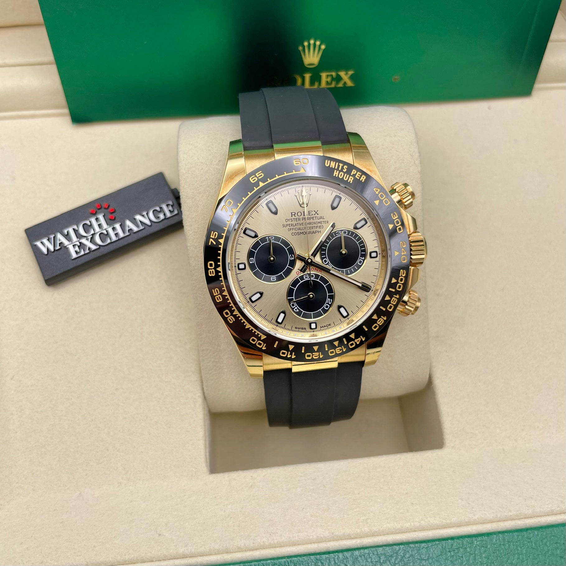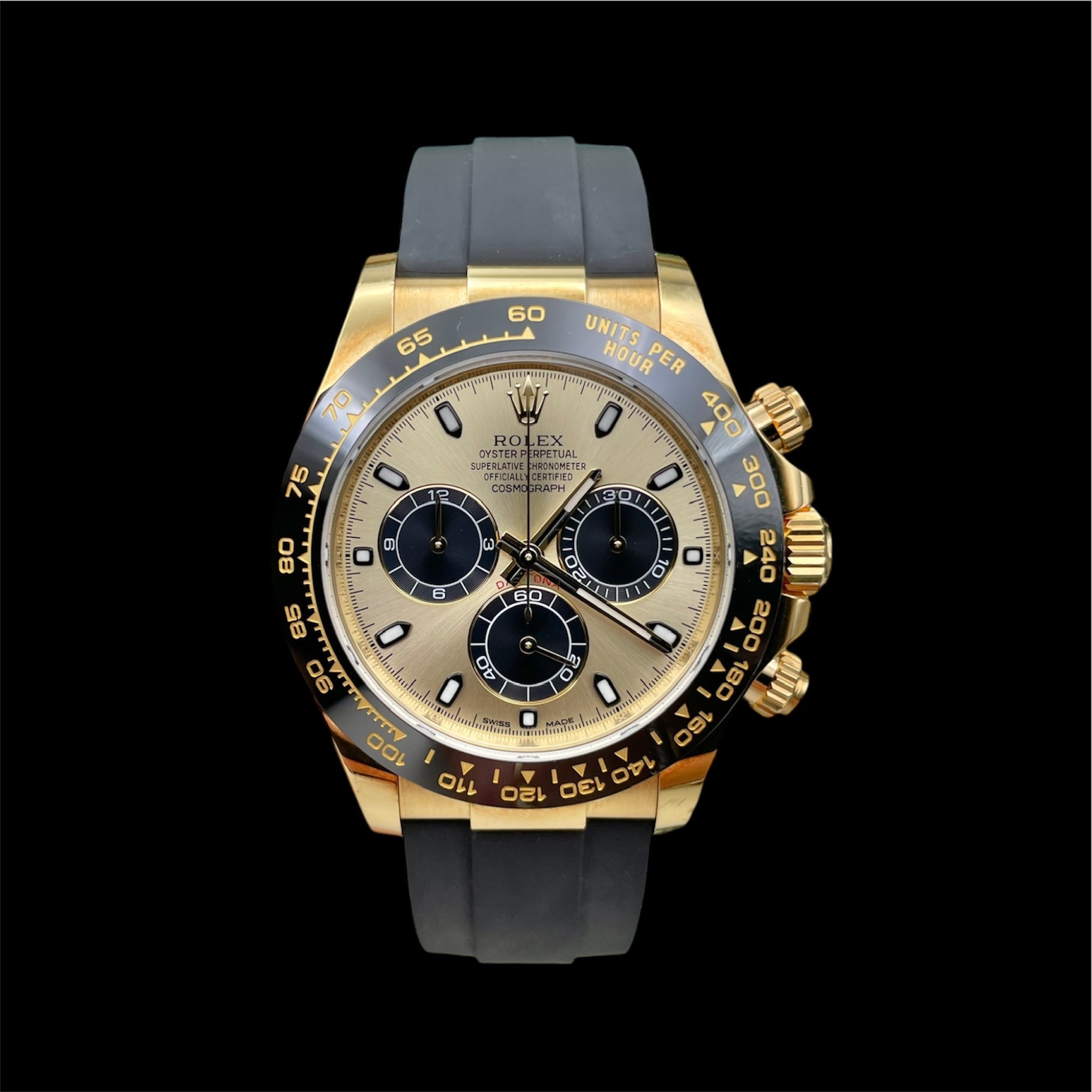 Description: Oysterflex bracelet, black ceramic tachymetric scale engraved bezel and champagne dial with black sundials and luminescent hour markers