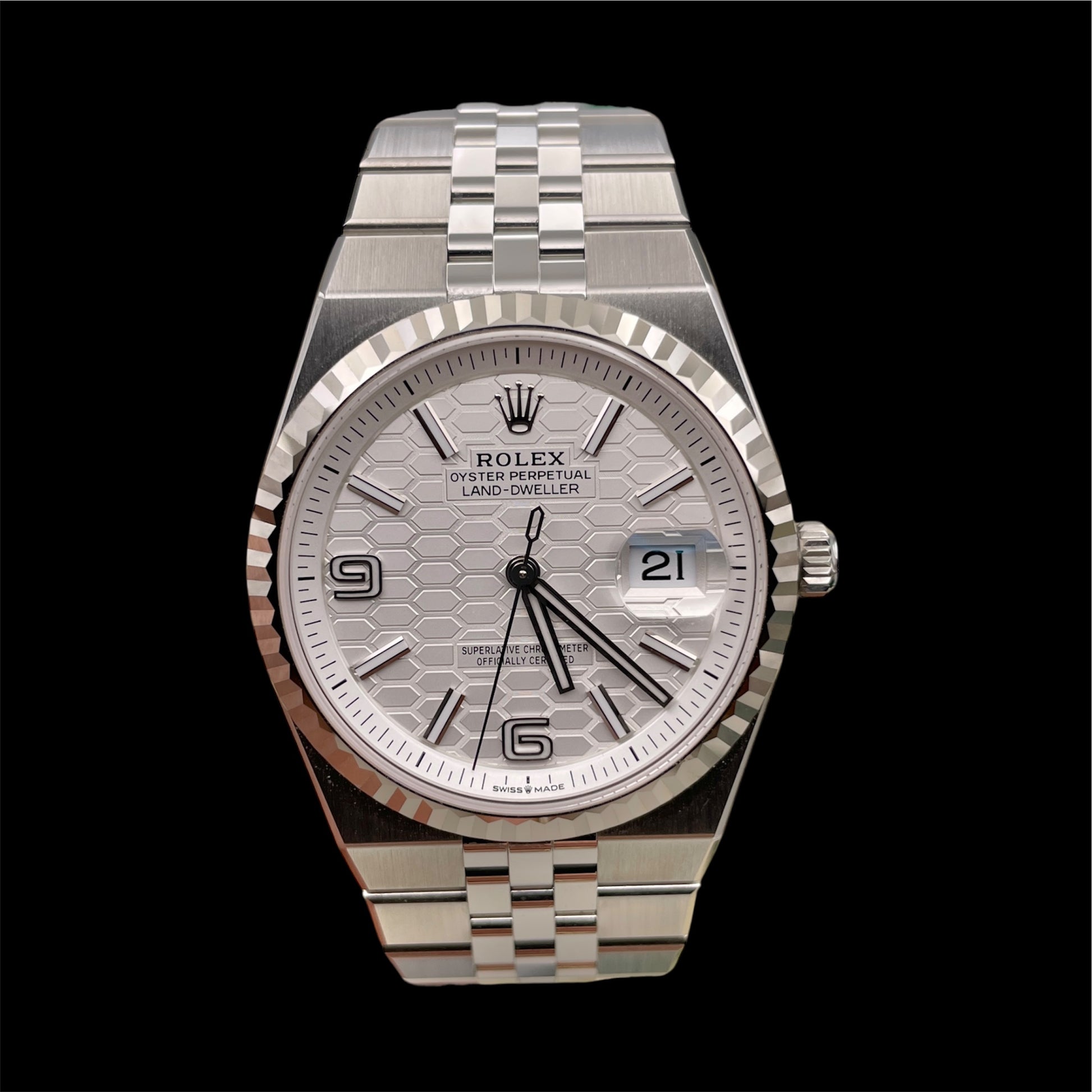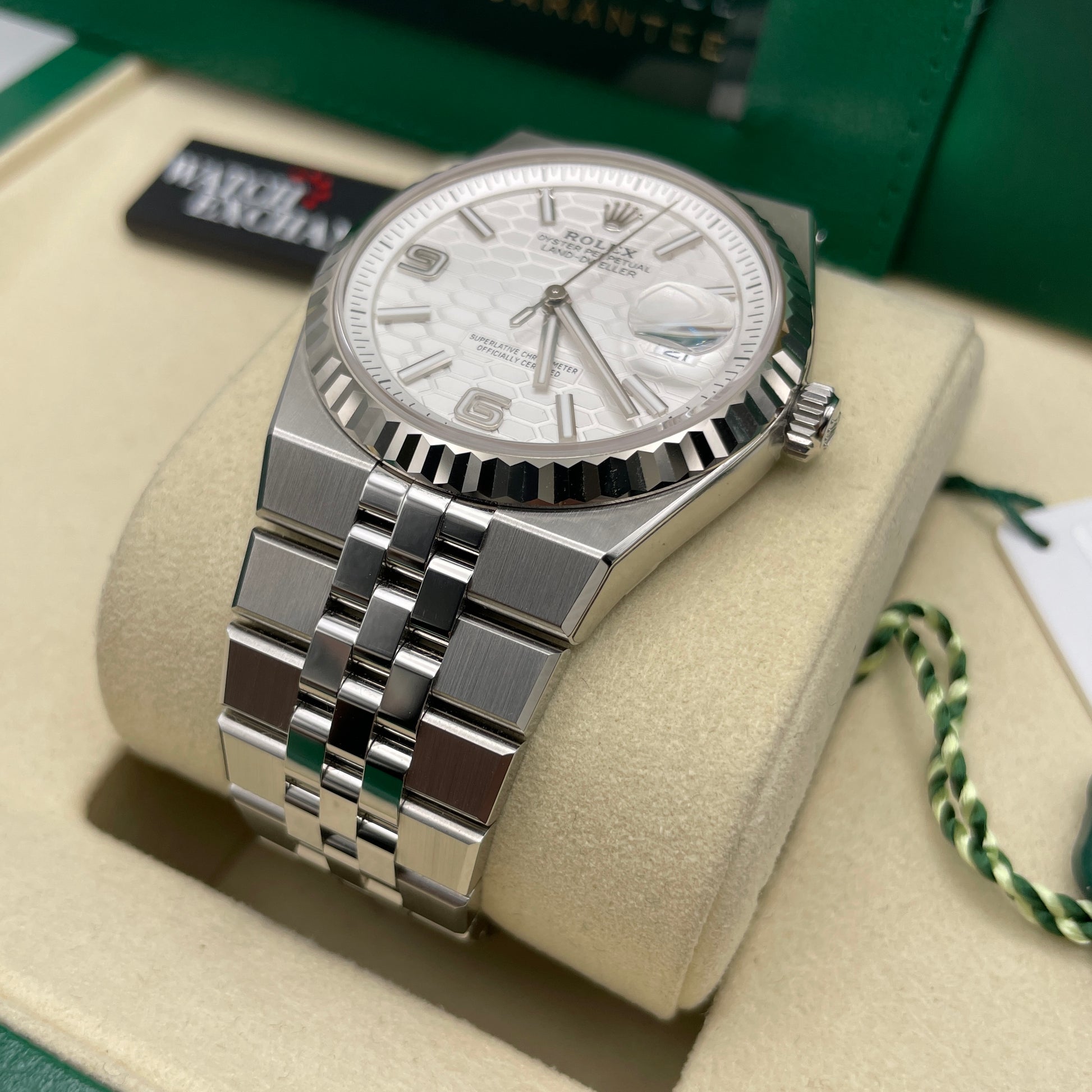 Description: Flat jubilee bracelet, fluted bezel and intense white honeycomb motif dial with luminescent hour markers