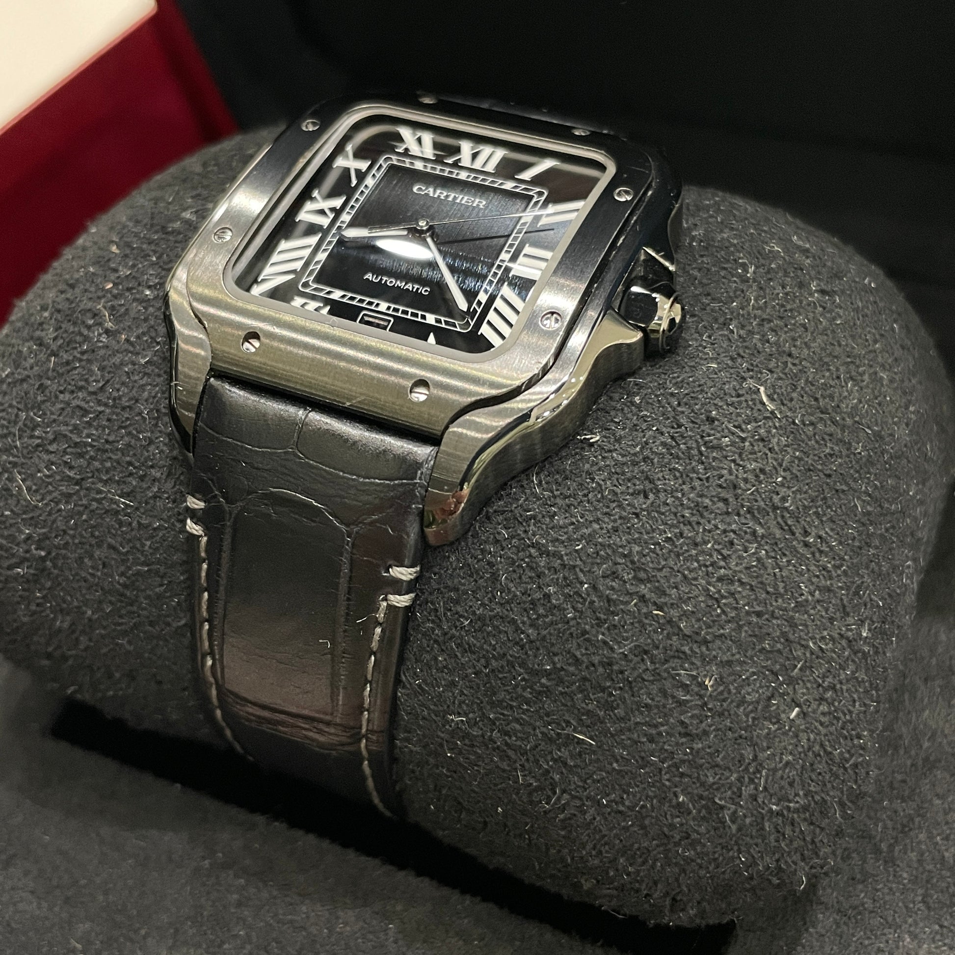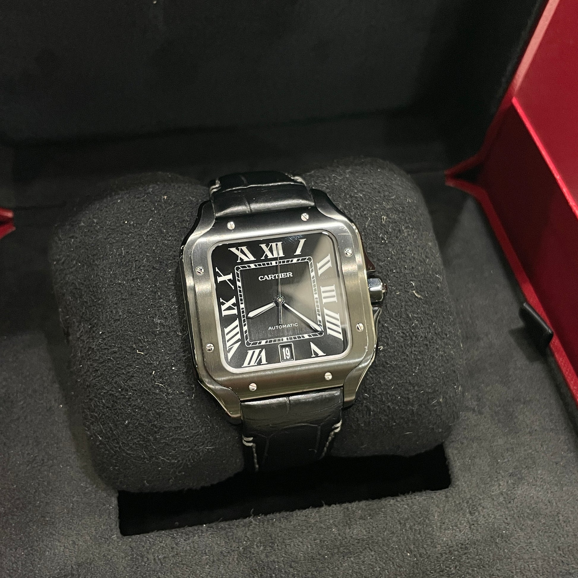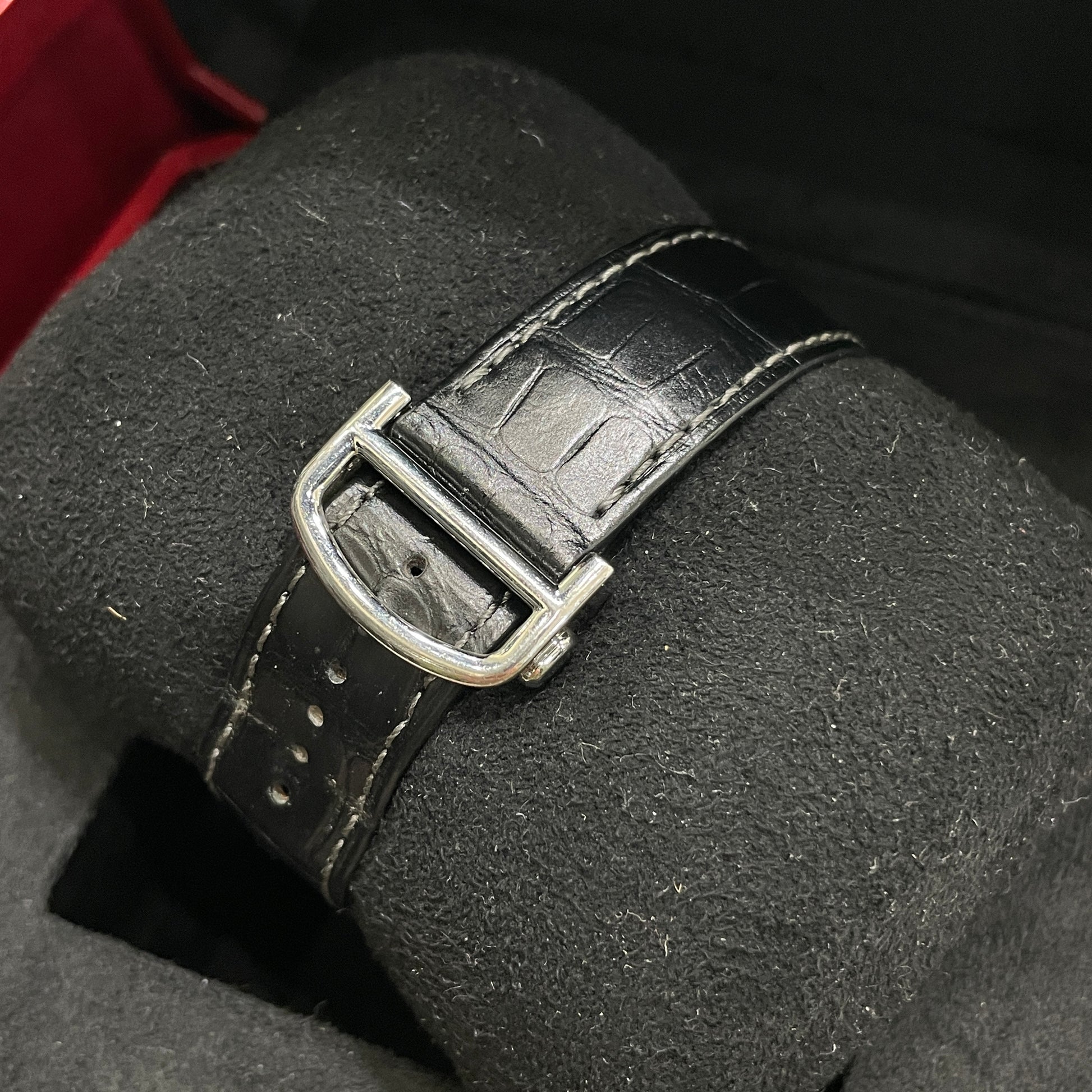 Description: Black leather strap, black dial with roman numeral hour markers. Comes with and additional black rubber strap