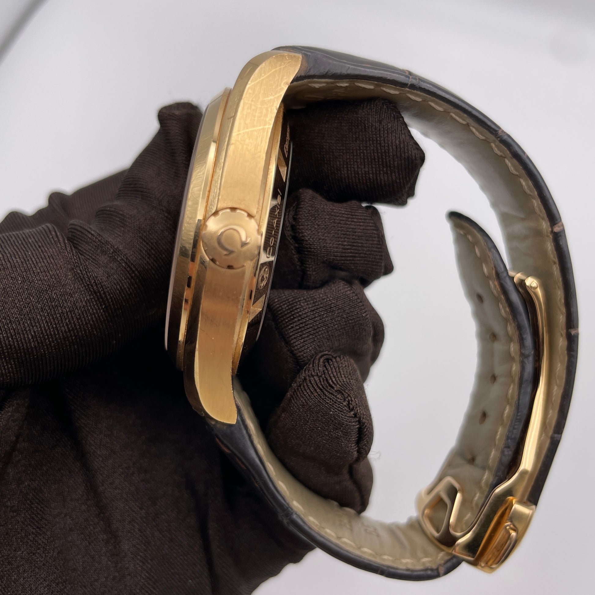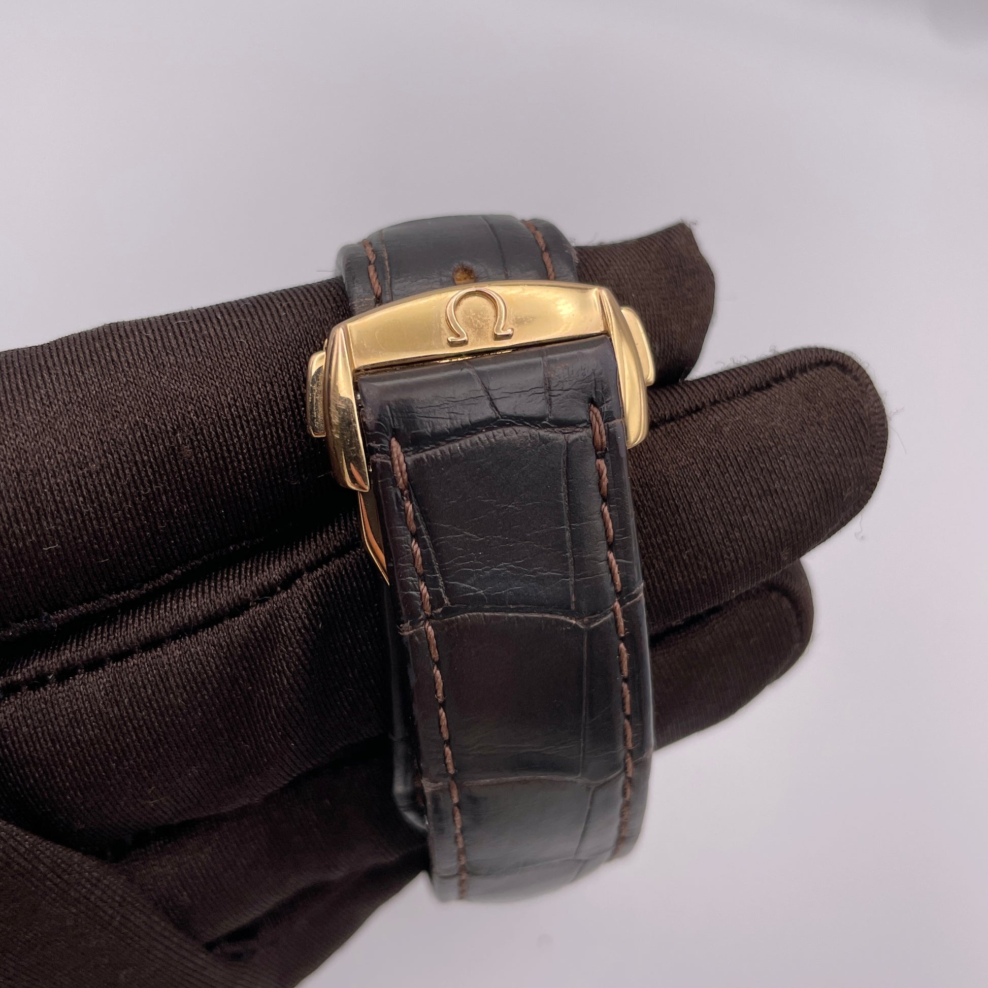 Description: Brown Crocodile leather strap with a rose gold deployment buckle, grey dial with luminescent hour markers
