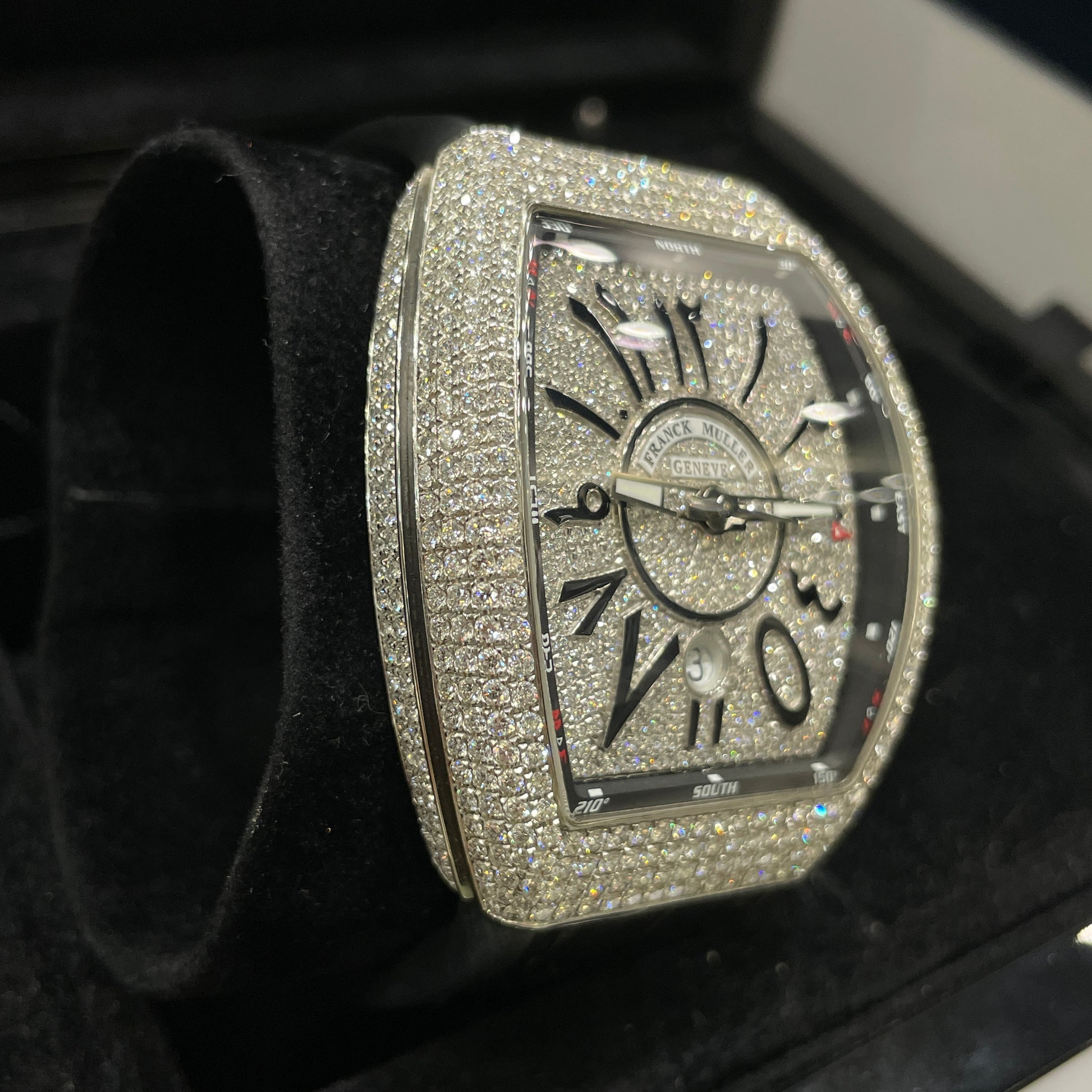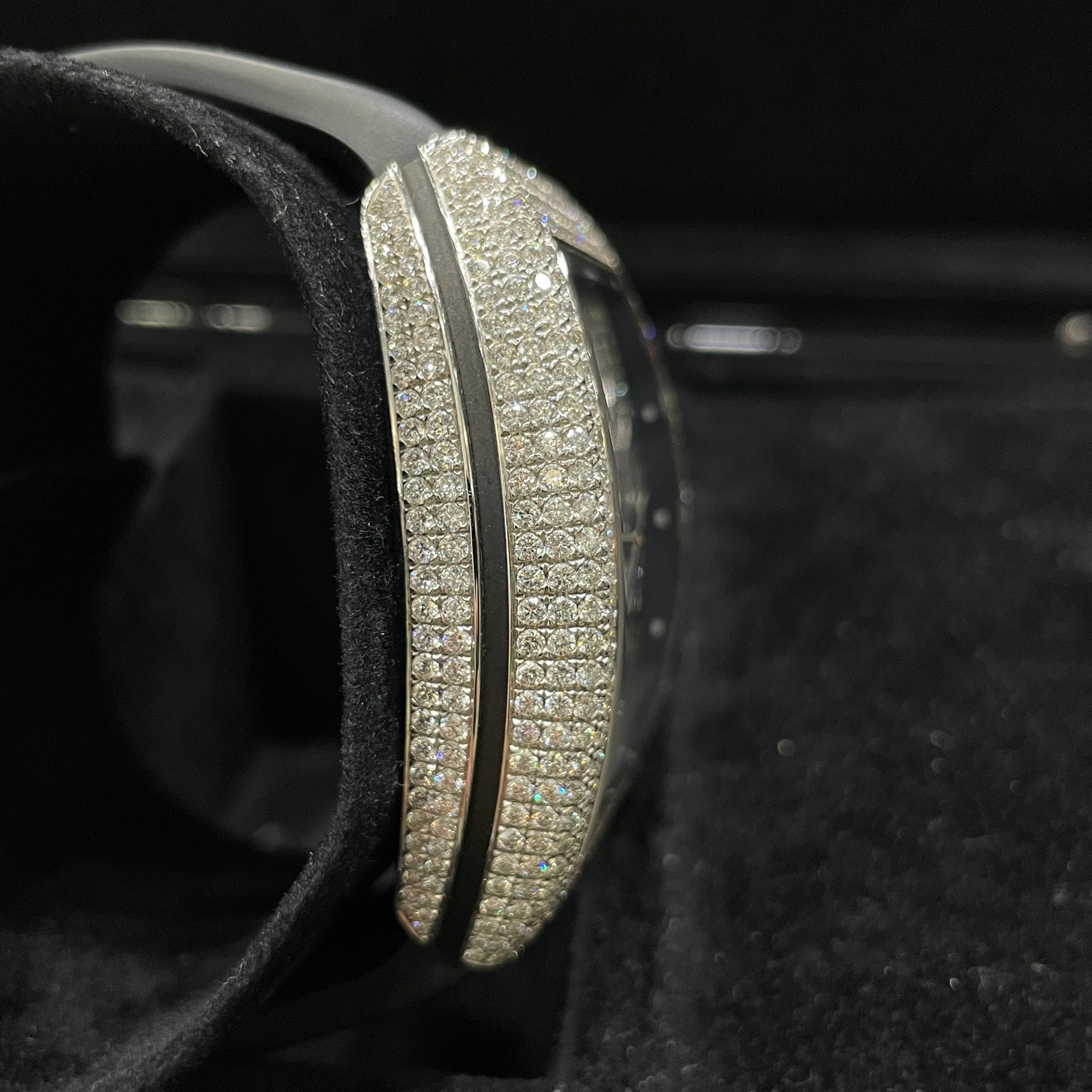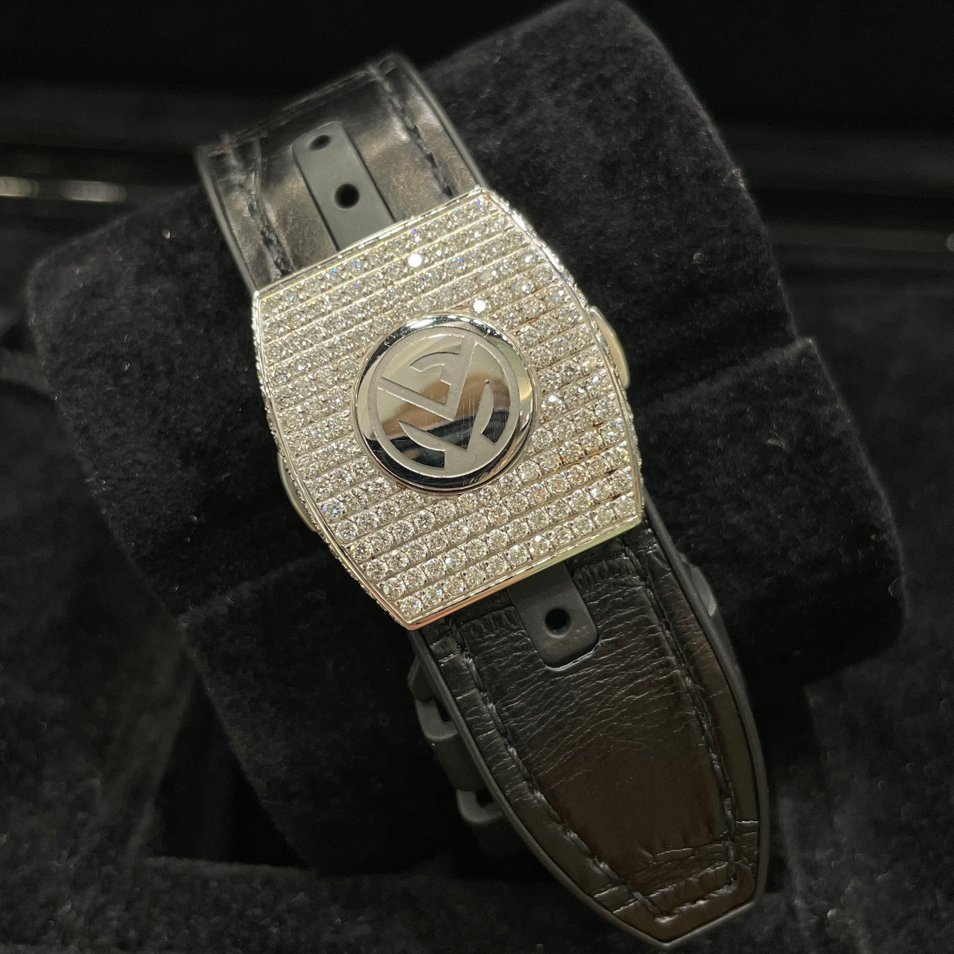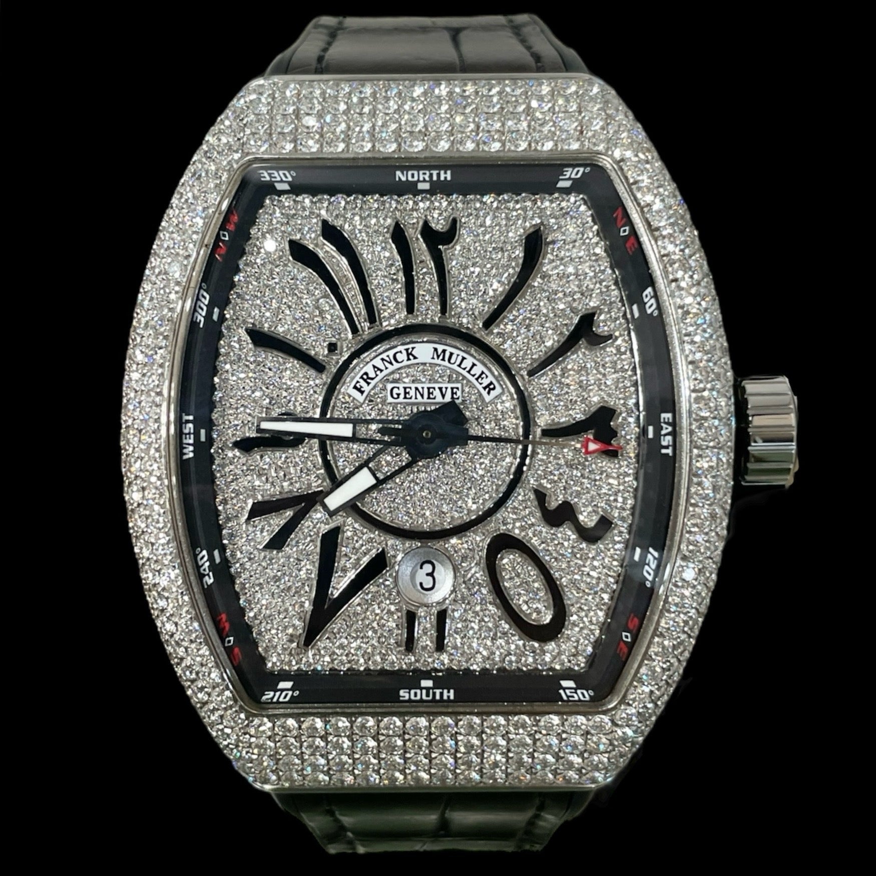 Description: Black crocodile leather bracelet, Aftermarket diamond set with arabic number hour markers